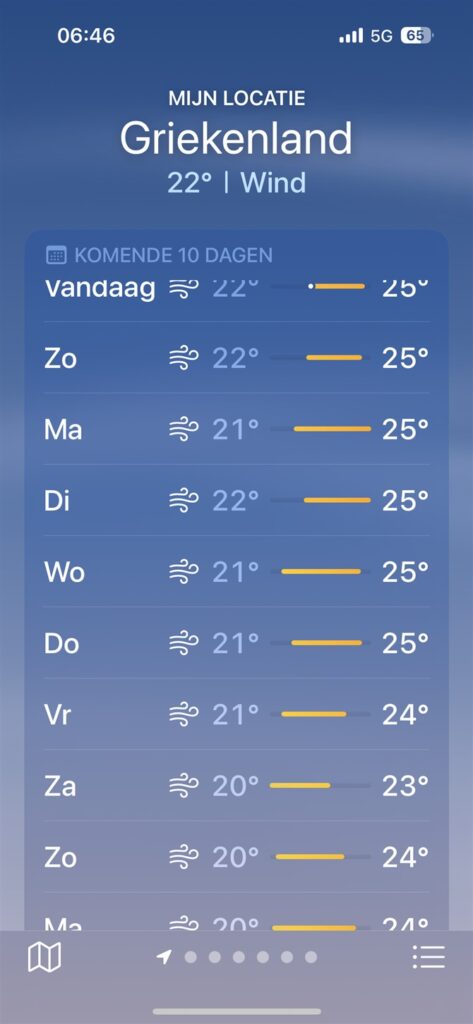 Momenteel zijn we op Tinos en beginnen de constante harde wind op de Cycladen een beetje beu te worden. Dit is bijvoorbeeld het huidige weerbericht.